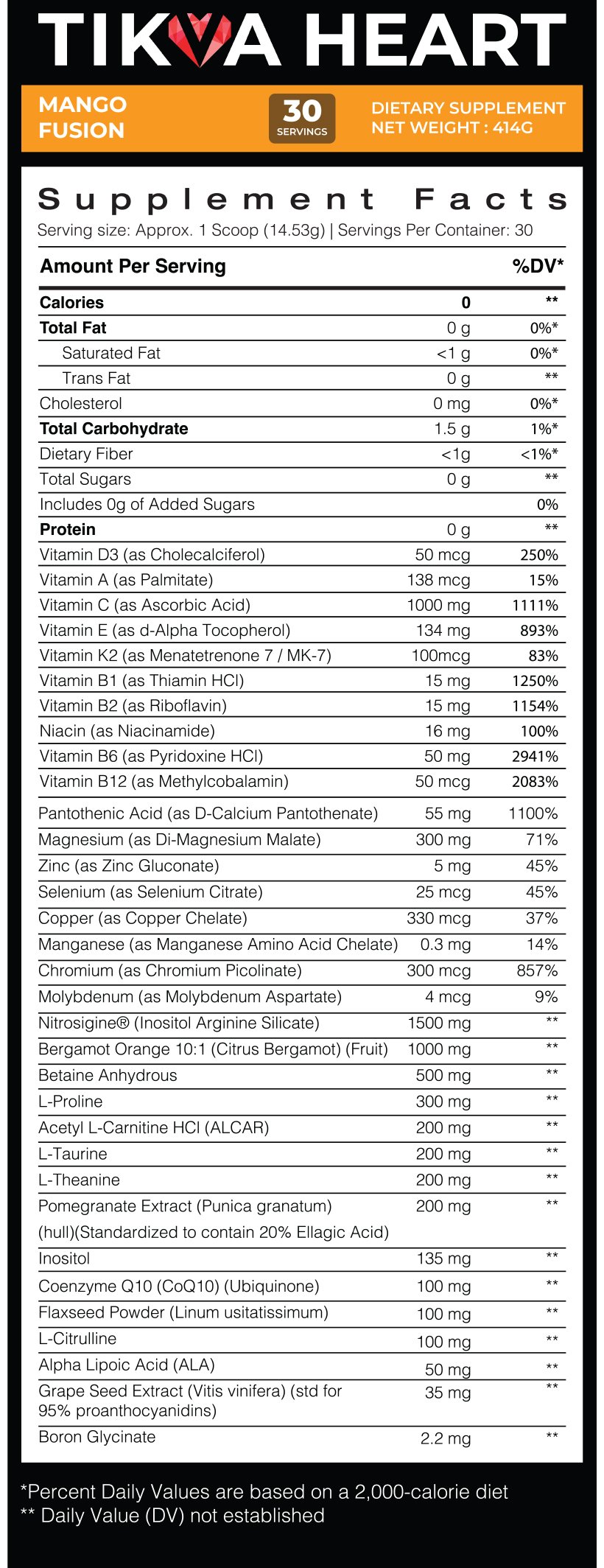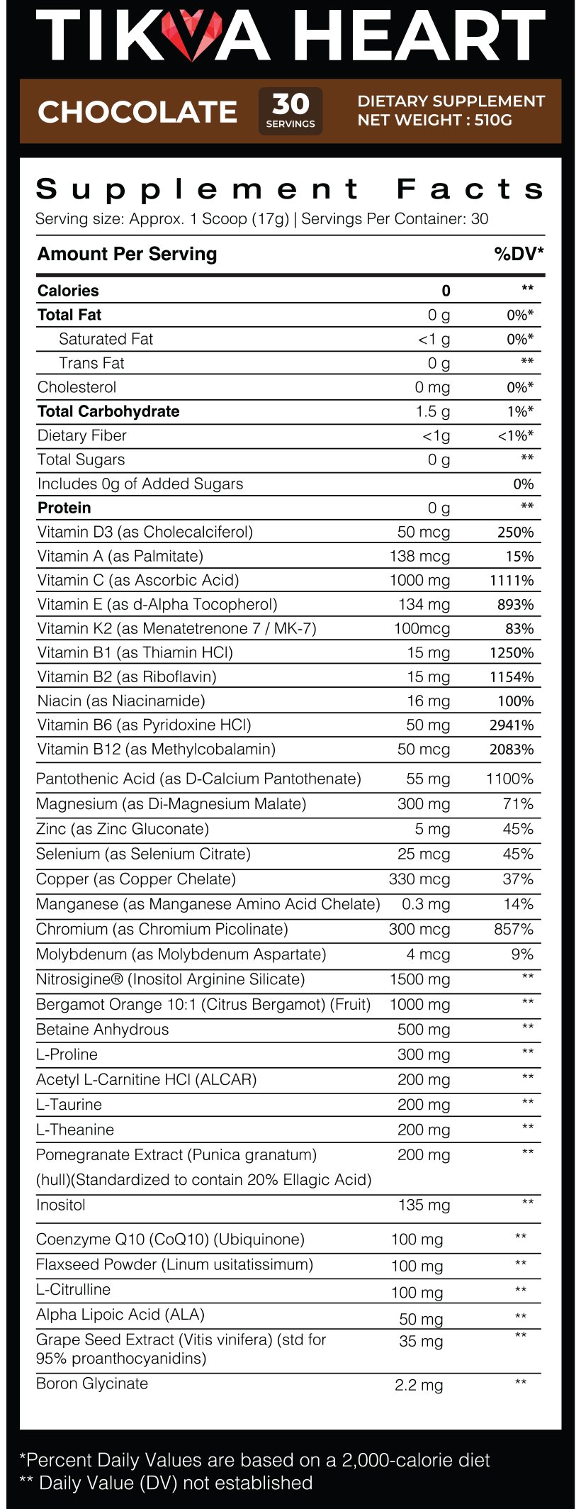 Arginine, Beet Root, Pomegranate, L-Carnitine, Vitamin C, L-Taurine, L-Theanine, Inositol, Coenzyme Q-10, and Alpha Lipoic Acid